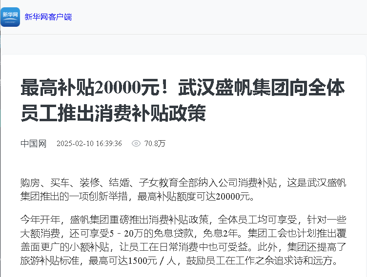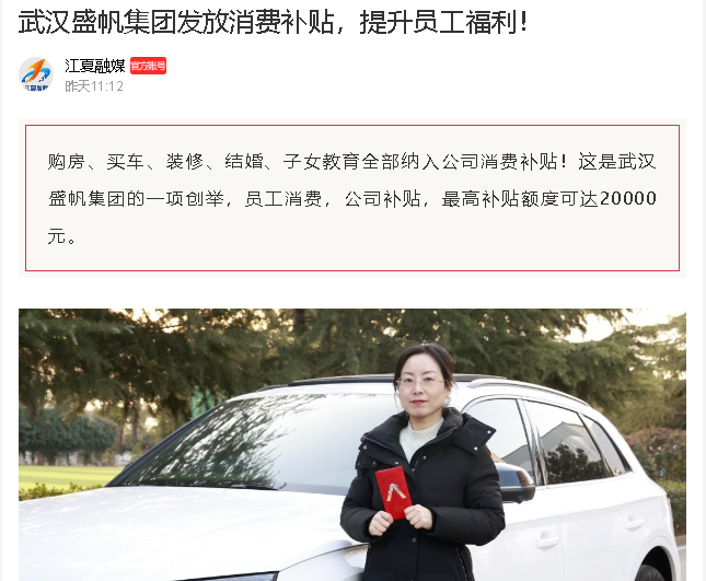 购房、买车、装修、结婚、子女教育全部纳入公司消费补贴,这是武汉HJC黄金城集团集团推出的一项创新举措,最高补贴额度可达20000元···