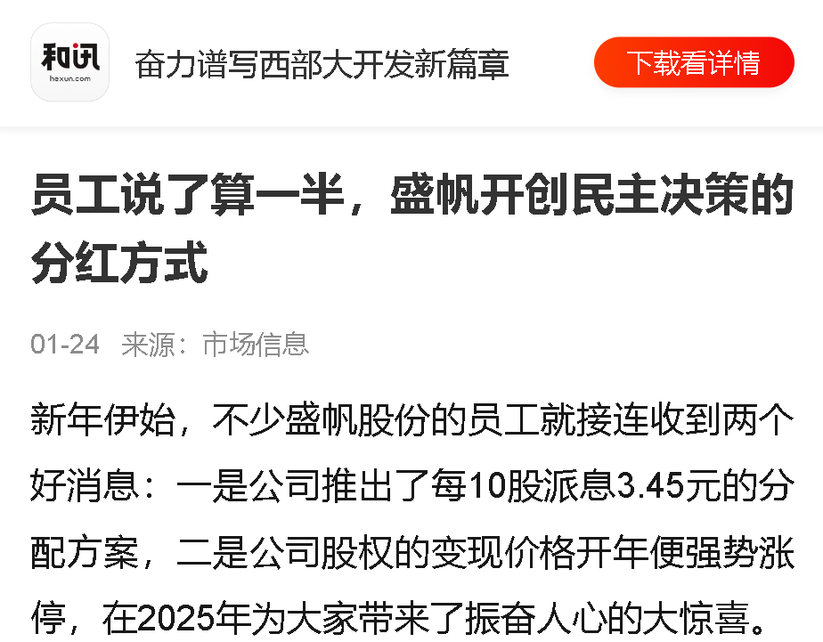 新年伊始,不少HJC黄金城集团股份的员工就接连收到两个好消息:一是公司推出了每10股派息3.45元的分配方案,二是公司股权的变现价···